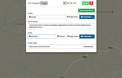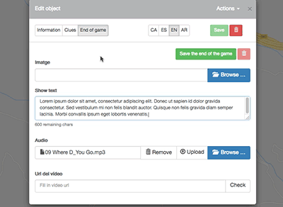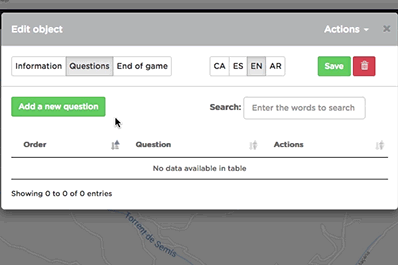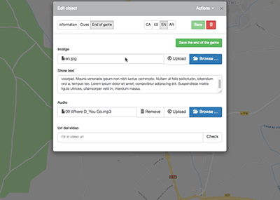 The place to find: Georeference the place of the object or space to find. Optionally, you can add questions that the user has to solve when they arrive to the place to be able to obstain the clue for the next place to find.