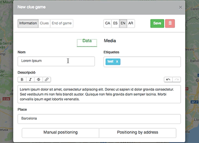 To create the clue we must take into account the 3 tabs; the information of the clue, the place to discover and the questions when arriving.