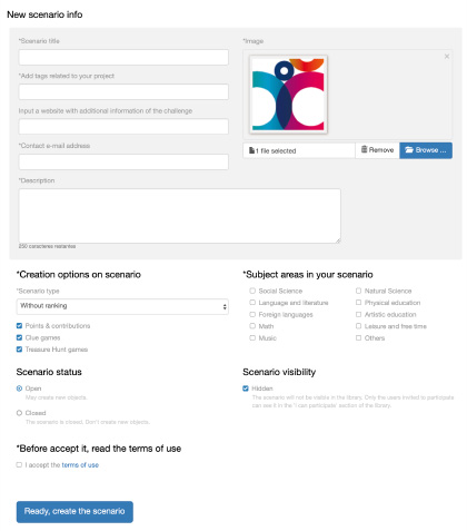 2.1 Begin by filling in the scenario title Title, add a image, indicate a contact email and add the tags that will help other users find your scenario.